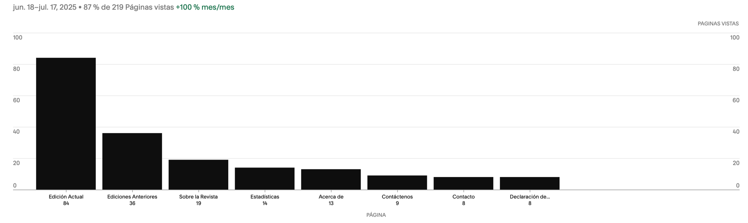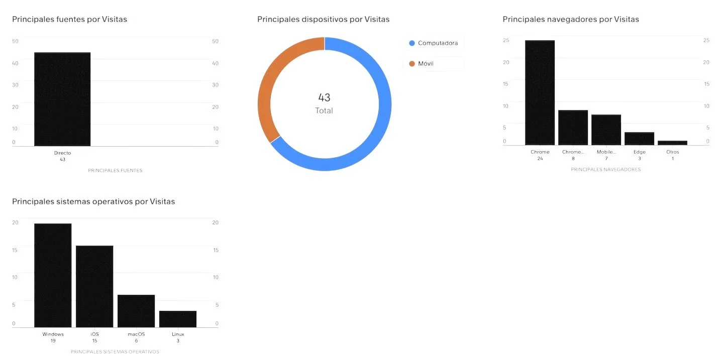 En esa sección usted encontrará una serie de gráficos con la información de tráfico y registro de actividad más relevante de acceso, principales fuentes, dispositivos, navegadores y vistas de página. La información y los gráficos son generados mediante el API de Google Analytics